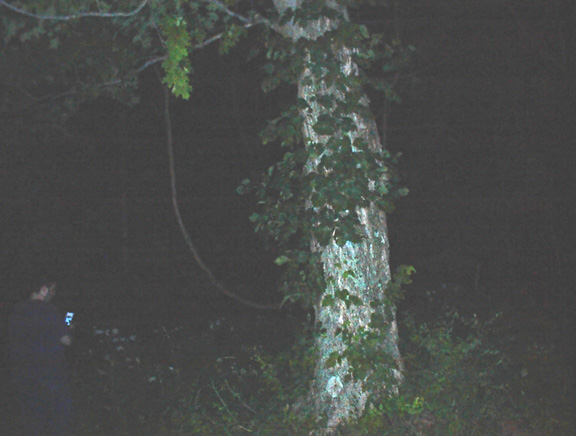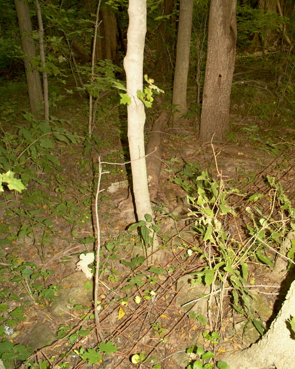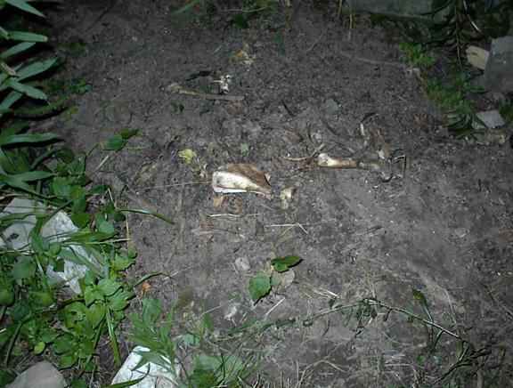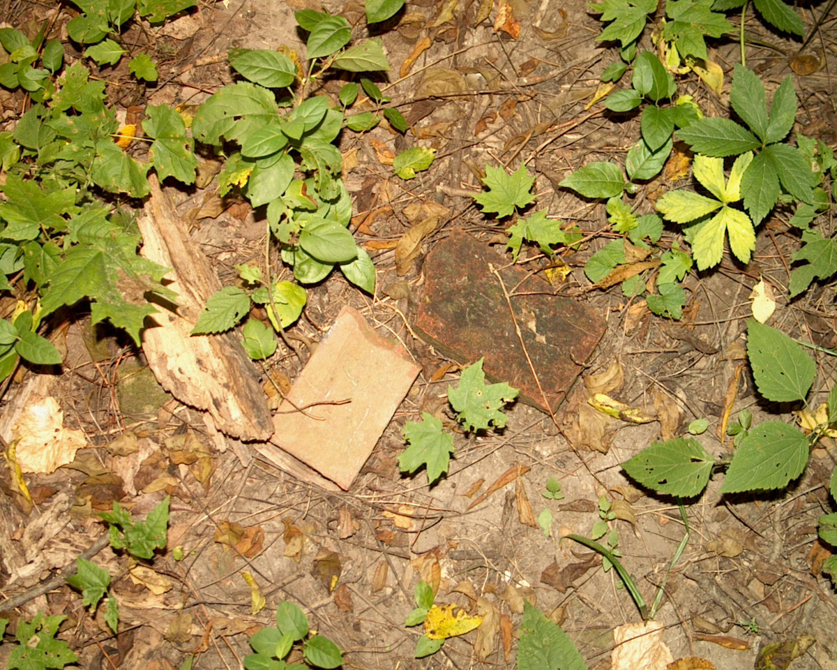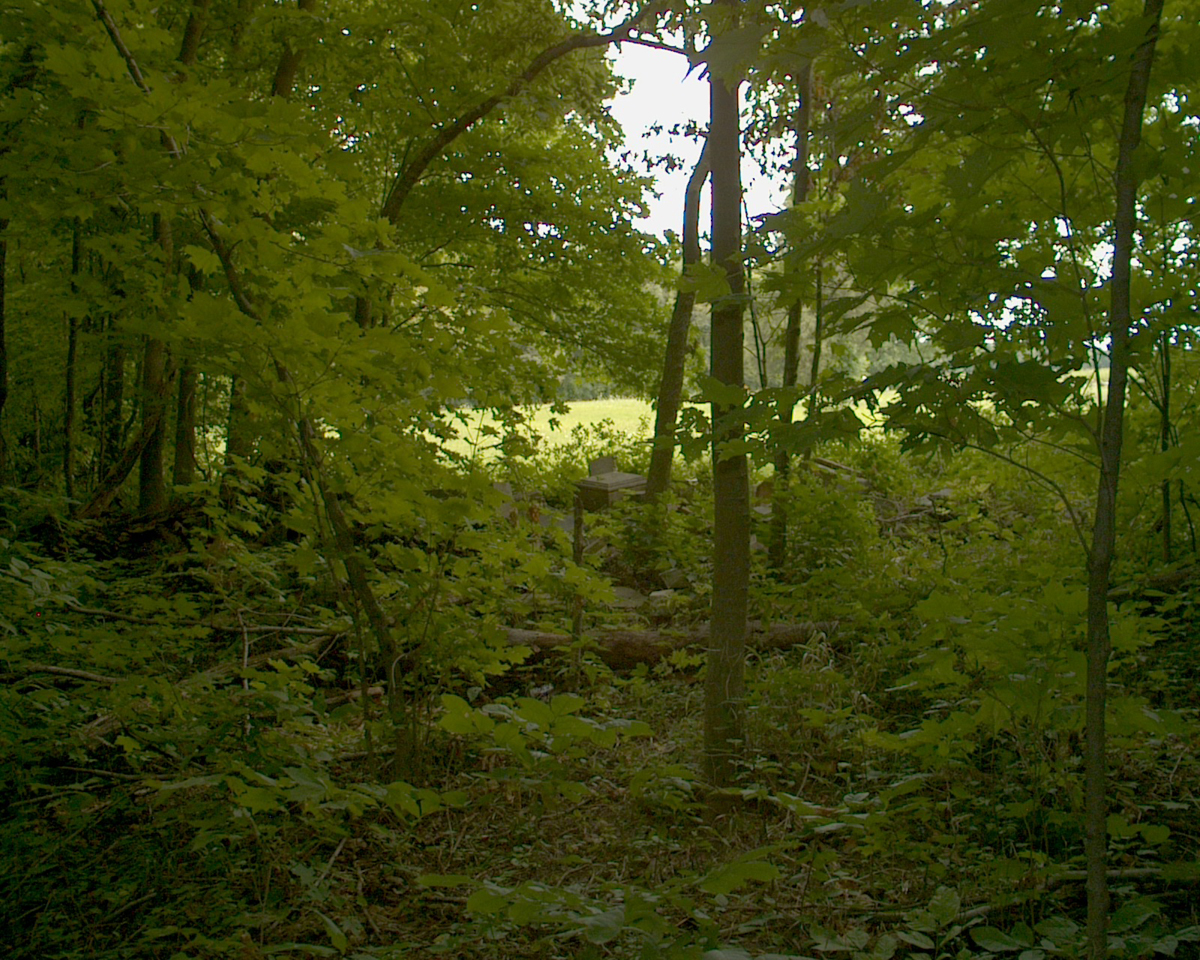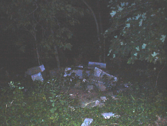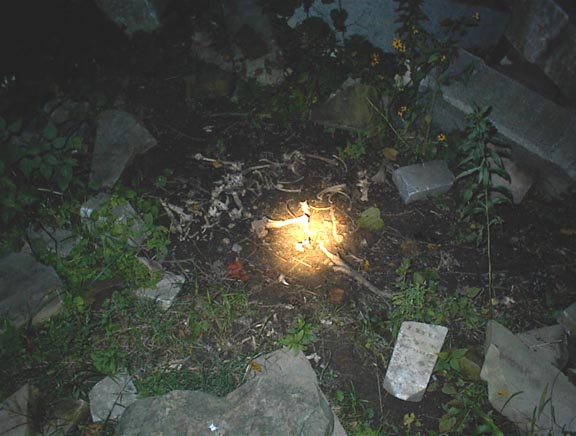 We arrived to the cemetery around 1:45 AM on our original trip in 2001. That night was particularly creepy because we stumbled upon some bones of a dead animal, probably some sort of canine. The bones were at the center of a large circle of tombstones in the rear of the cemetery. A set of jaw bones laid on top of one of the tombstones. After looking at the bones for a few minutes, we heard something coming through the woods toward us, so we got out of there. We recorded very high electromagnetic field readings next to a large tree in the rear of the cemetery before leaving, peaking at the top of the scale.