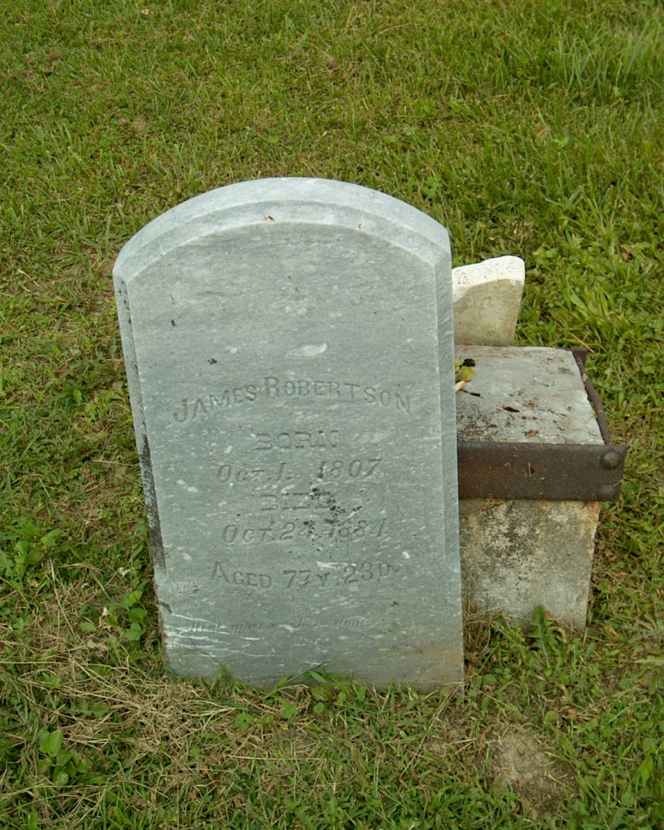 The tombstone of James Robertson was propped up against another stone. James died on October 24, 1884 a few weeks after his 77th birthday.