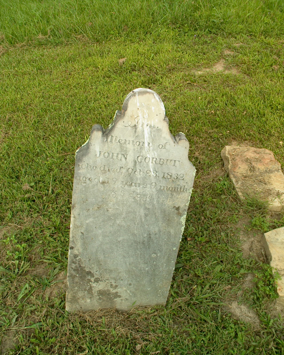The tombstone of John Corbit, who was the first of three siblings to die in the fall of 1832. John died on October 23, 1832 at 19-years-old.