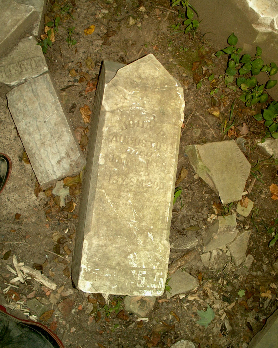 One of the many broken tombstones belonged to John P. Augustus. He died at 48-years-old on July 9, 1888.