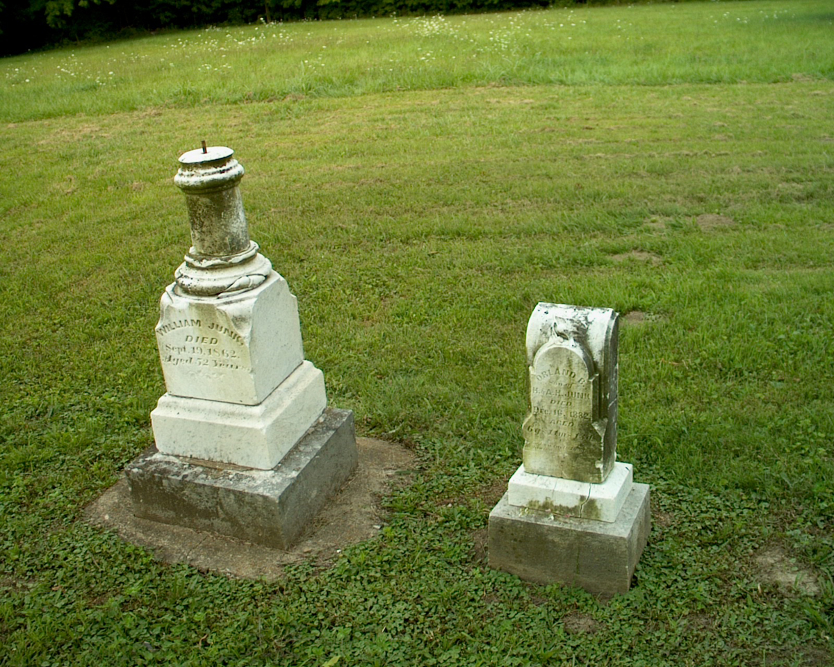 The tombstones for William and Orlando Junk. William died on September 19, 1862 at 52. Orlando died on December 16, 1882 at only six years old.