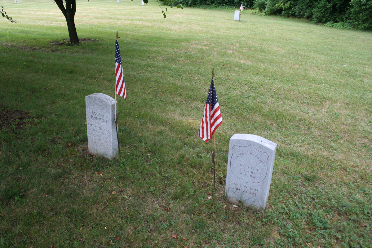 The tombstones of Robert Johnson, who served in the War of 1812, and James Hoop, a Civil War veteran.