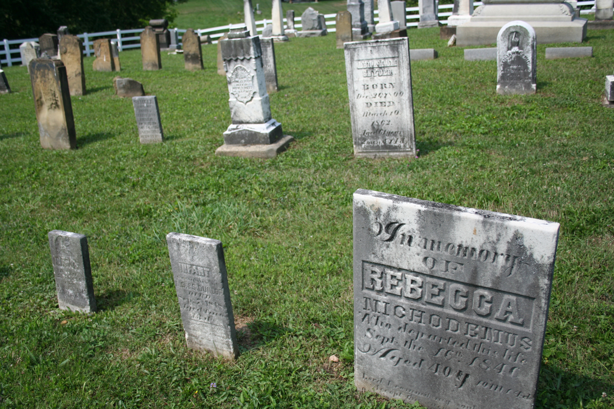 A few tombstones in the cemetery. The one in the foreground belonged to Rebecca Nichodemus, who died in September 1846.