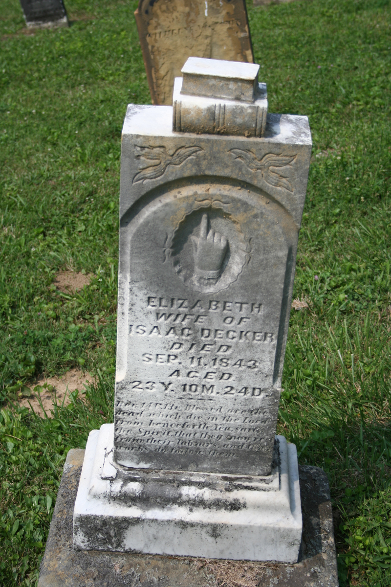 The tombstone of Elizabeth Decker, wife of Isaac. She died on September 11, 1843.