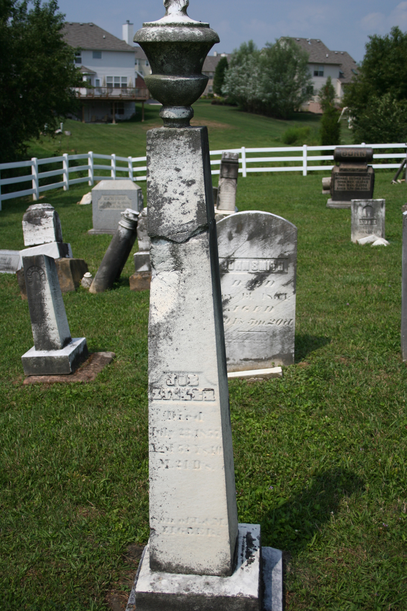 The OES visited Job’s Cemetery on July 30, 2007. Also known as Hiob’s Cemetery, the burial ground is along the old Amanda Northern Road near Canal Winchester at the former site of Saint Job’s German Reformed and Evangelical Lutheran Church. The church building’s cornerstone remains in the cemetery with the inscription, “HIOB’S CHURCH BUILT BY THE EVANGELICAL LUTHERAN & GERMAN CONGREGATION IN THE YEAR OF OUR LORD 1849.” The church was demolished years ago and the records were moved to the Reformed Church in Canal Winchester. There are quite a few burials here and the cemetery was extremely well kept at the time of our visit. Most of the tombstones were intact and could be read, although there were a few that were broken and not in their original positions. According to records, the earliest burials took place in the 1830s and the most recent was in the 1960s.