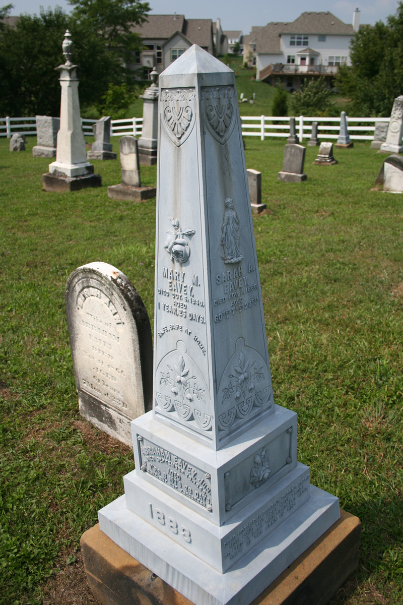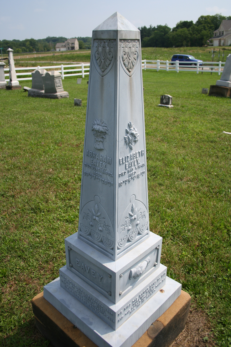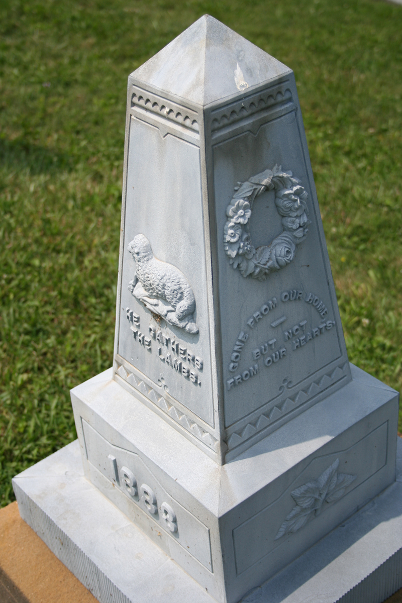 The zinc tombstone of Abraham, Sarah and Mary Eavey, erected in 1888. Mary passed away in 1846 at only one-year-old.