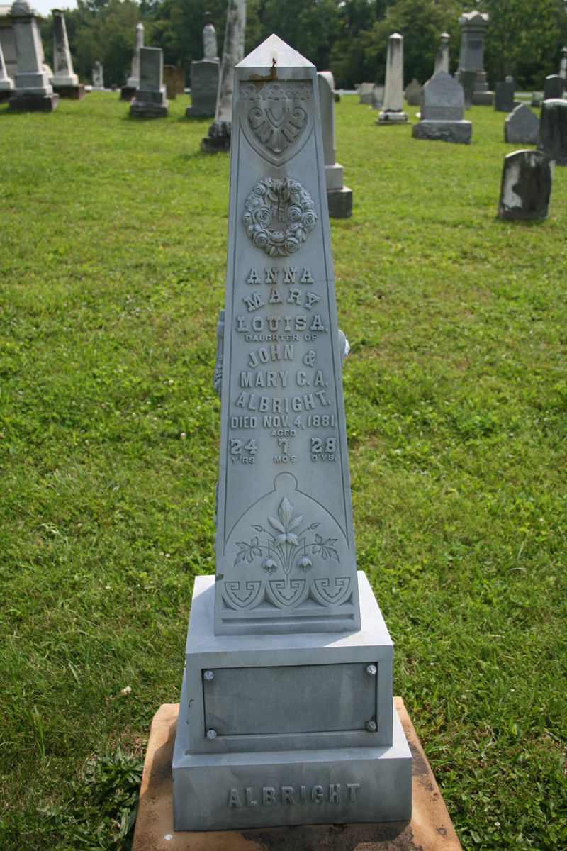 The zinc tombstone of Anna Mary Louisa Albright. Anna was only 24-years-old when she died.