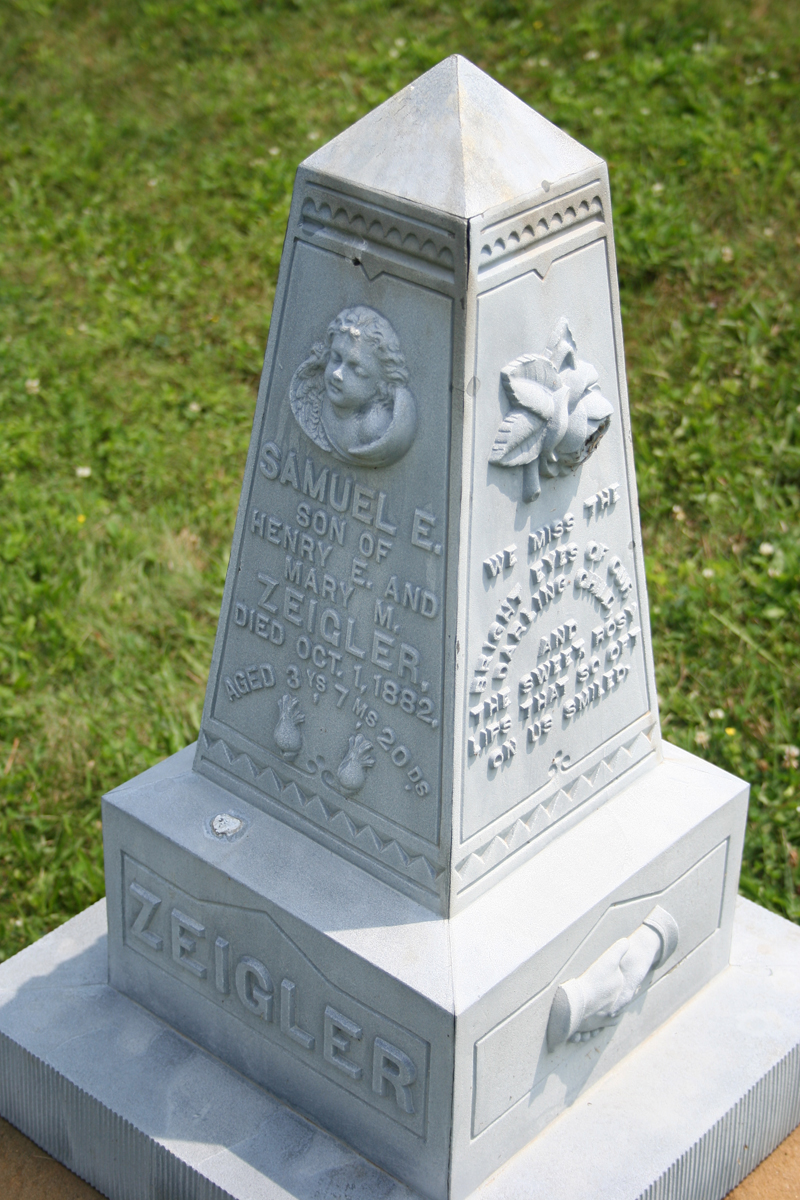 This small zinc tombstone belonged to 3-year-old Samuel Zeigler. It included a poem.