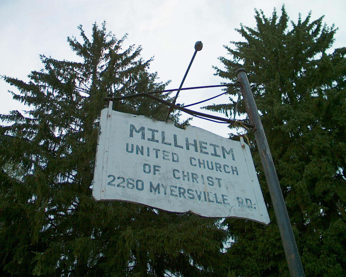 The weather-worn sign for Millheim United Church of Christ. The cemetery is on the church property.