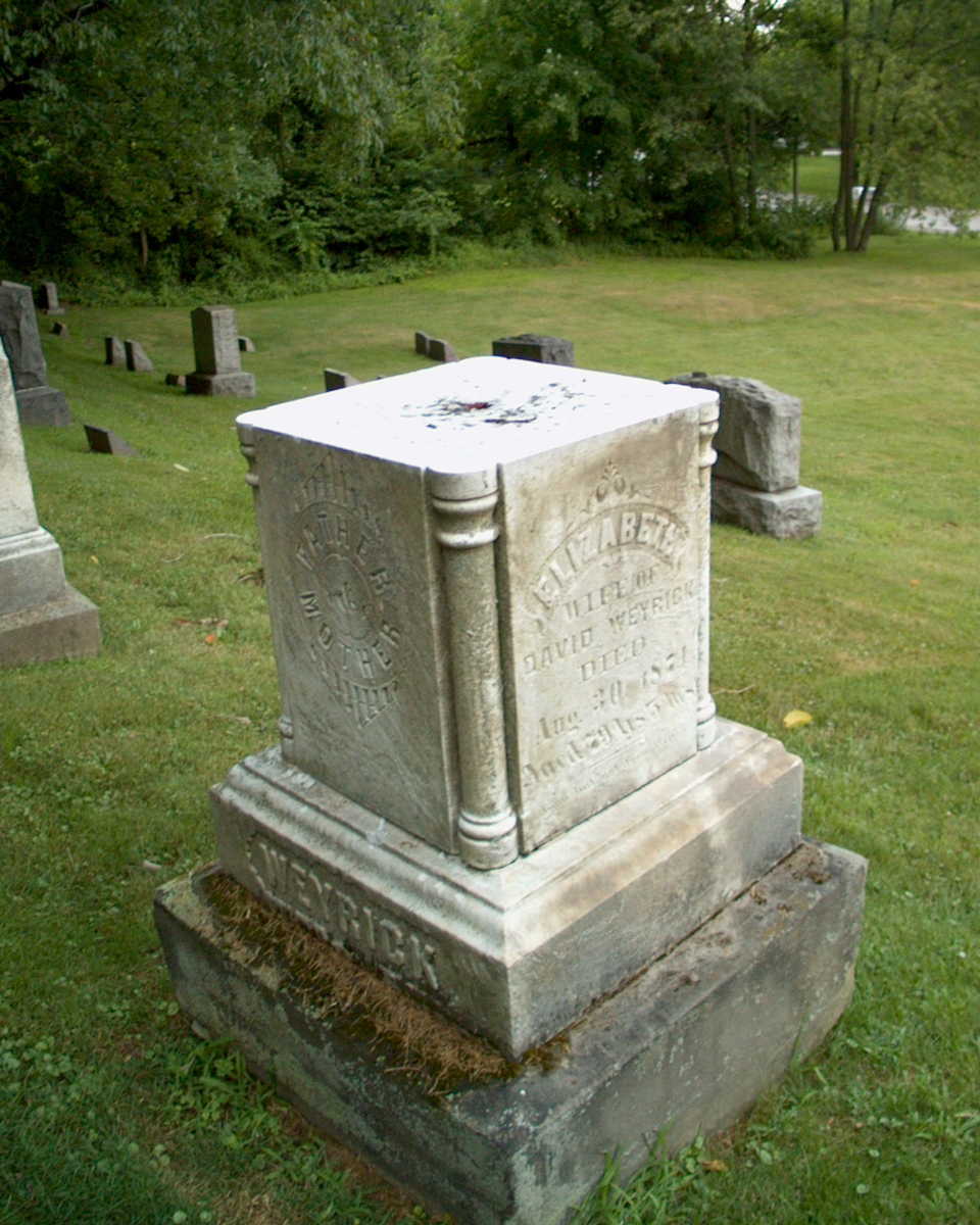 The tombstone of David and Elizabeth Weyrick. Elizabeth was born in 1795 and died on August 30, 1873. David was born in 1798 and died on September 27, 1873.