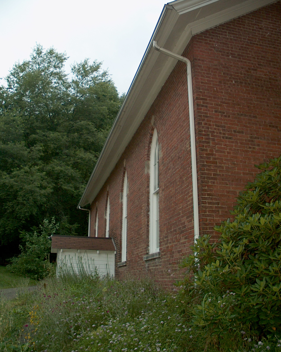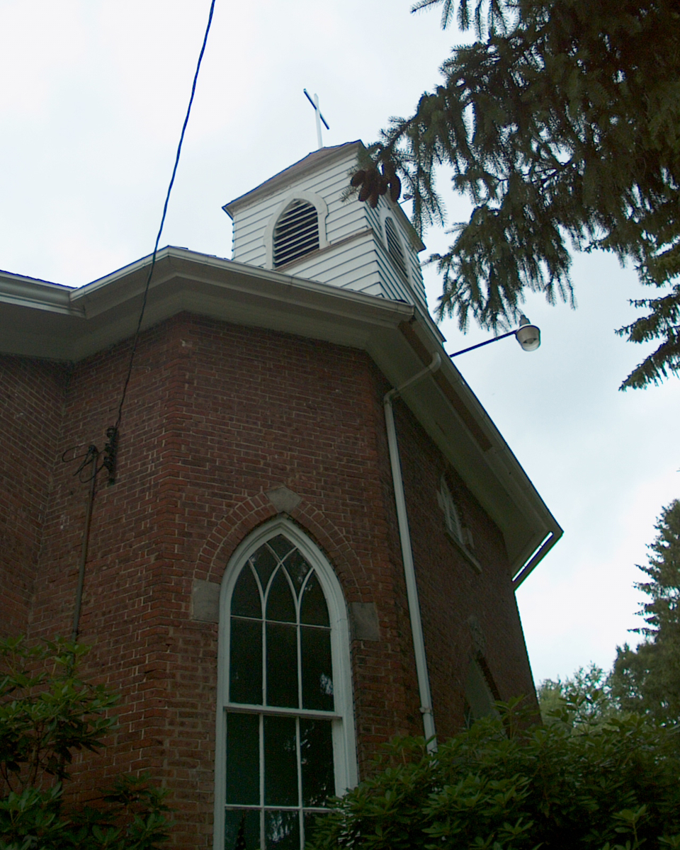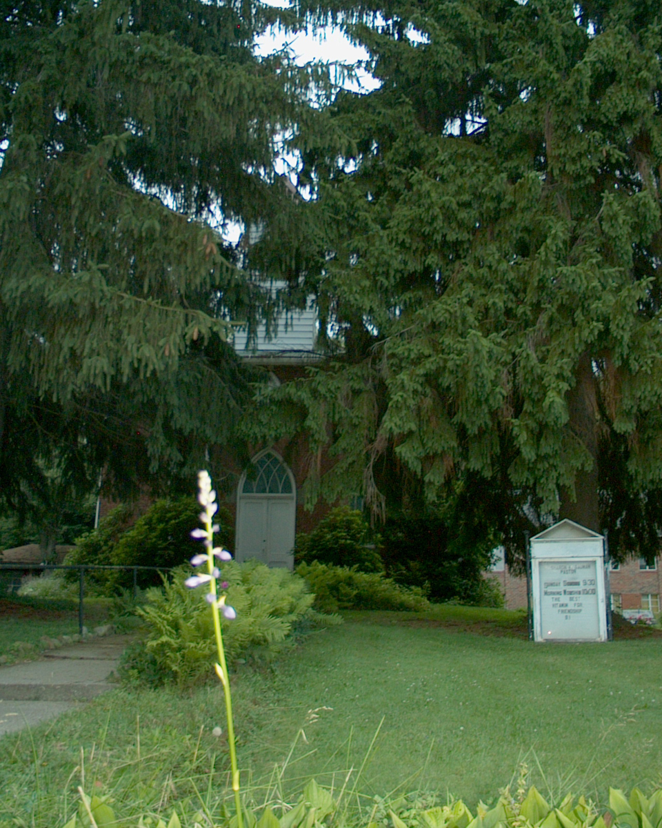 The front of the church was obscured from the road by two large evergreens.