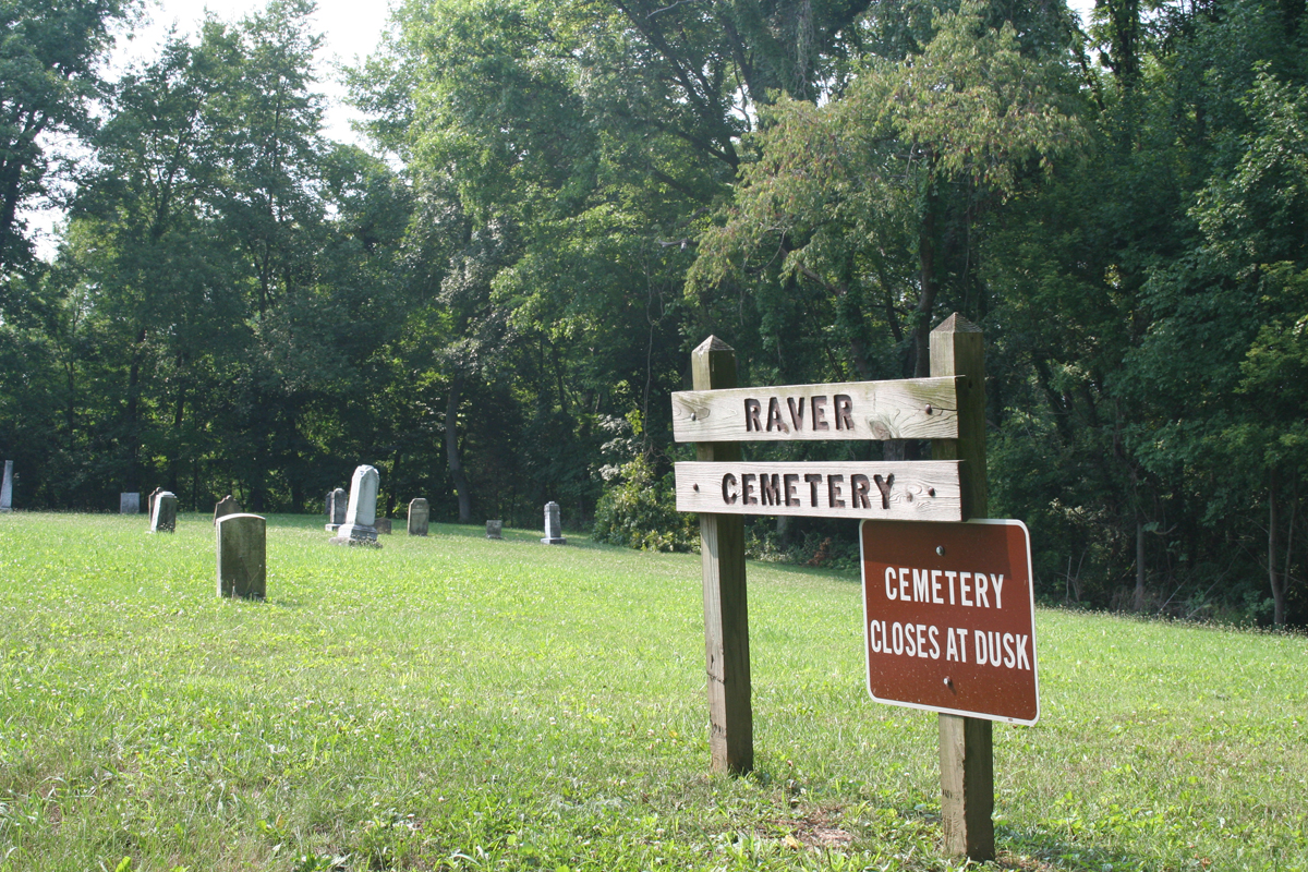 This wood sign marked Raver Cemetery at the top of a will along Waterloo Eastern Road.