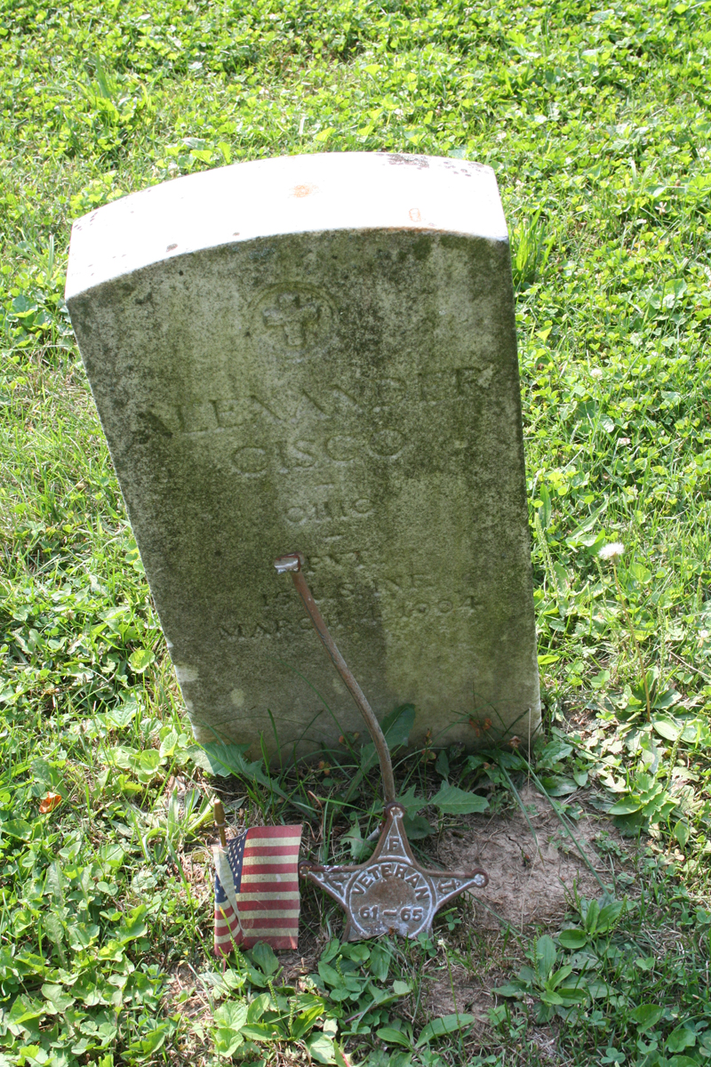 The tombstone of Civil War veteran Alexander Cisco, who served a private in the Ohio 15 US Infantry. He died on March 4, 1904.