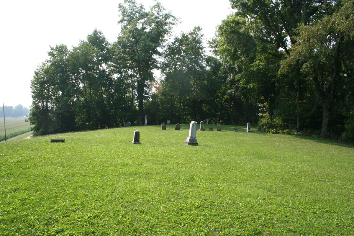 The OES visited Raver Cemetery on July 30, 2007. Raver Cemetery is located on top of a small hill just north of Waterloo Eastern Road in Violet Township. It can easily be missed if you do not know exactly where the cemetery is as most of the cemetery is not at road level. There were only a few tombstones standing and some of those were illegible, but others were in fair condition. There are likely many unmarked burials as tombstones fell and/or were removed over time. Historical records indicate the earliest known burial took place at Raver Cemetery in 1821 and the last burial was in 1901. There is at least one Civil War veteran buried at the cemetery.