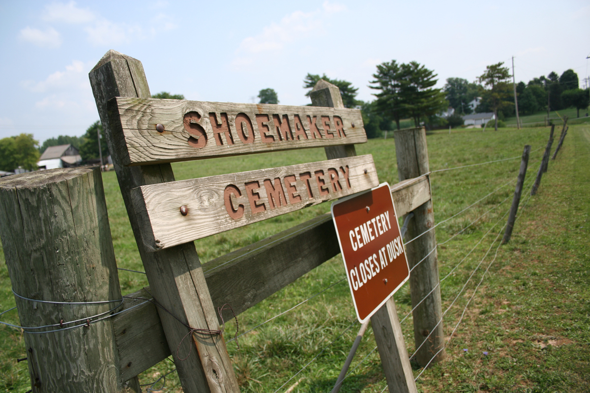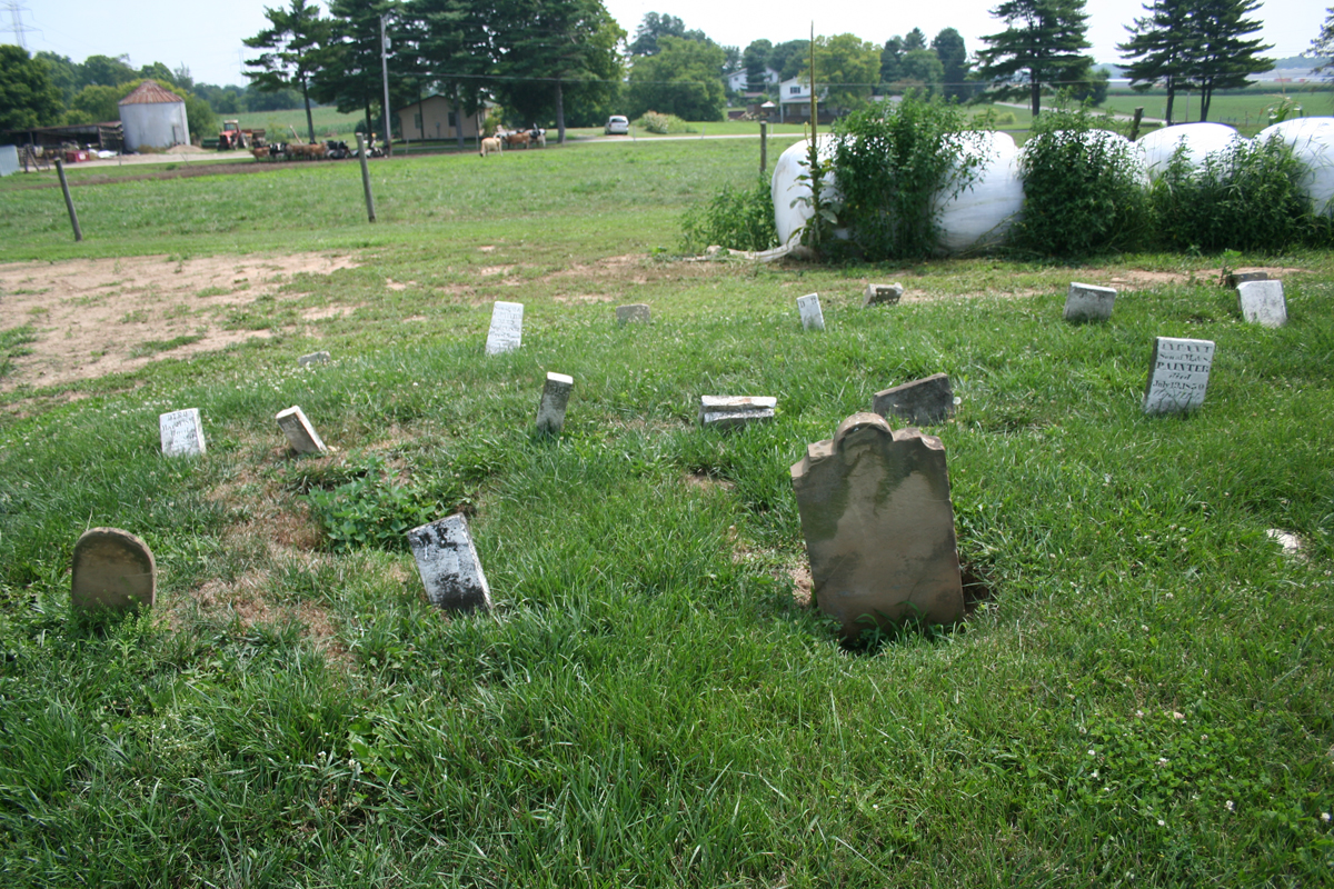 The OES visited Shoemaker Cemetery on July 30, 2007. This small family cemetery was probably founded around 1813 when Eric Shoemaker was buried there, who died that same year. His stone is likely the oldest in the cemetery, although it was hard to tell due to erosion and broken stones. An iron fence that once surrounded the cemetery was removed in 1985. Not much was being done to preserve the cemetery as it stood on our visit. The grass appeared to be mowed every now and then, but the grave markers were in poor condition. There appeared the be a couple of holes dug into the graves by wild animals of some sort. One OES member who had previously visited the cemetery saw human bones lying outside one of the holes. Cemetery restorations are beginning to be commonplace in the area surrounding Shoemaker Cemetery. Perhaps it can be somewhat saved before it is too late as the property around the cemetery was for sale.