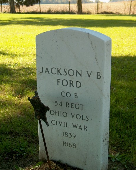 The tombstone for Civil War veteran Jackson V.B. Ford, who died in 1868.
