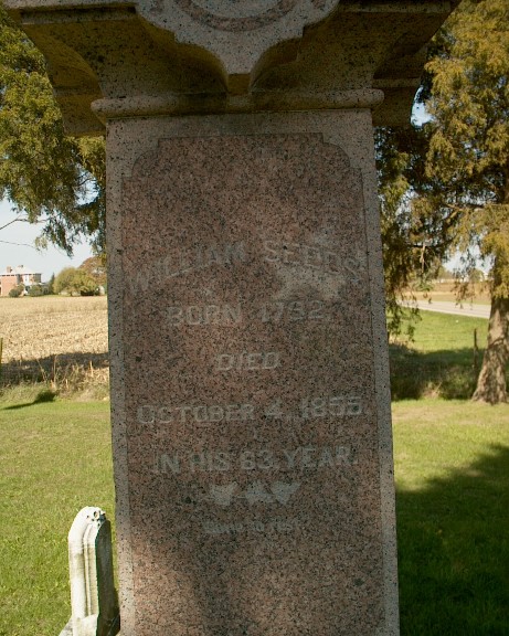 War of 1812 veteran WIlliam Seeds' tombstone. He died on October 4, 1855 at 63. His wife Margaret shares the stone. She died on February 14, 1893.