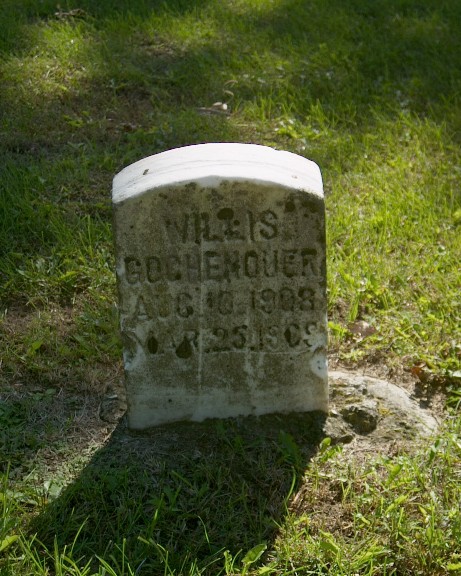 The small tombstone for Willis Gochenouer. Born on August 15, 1908, Willis only lived until March 24, 1909.