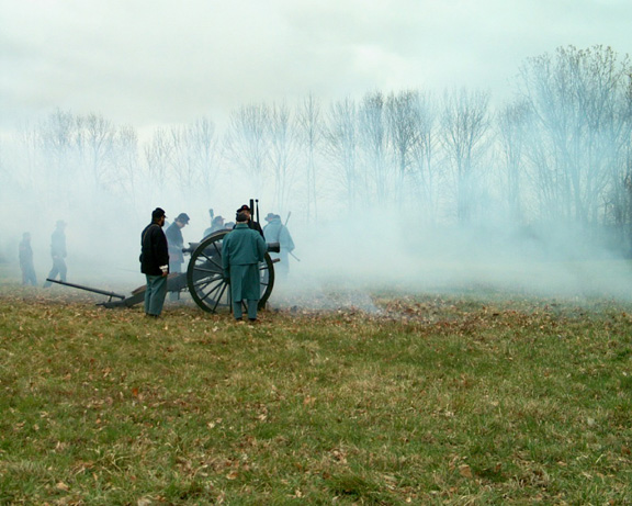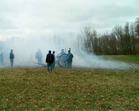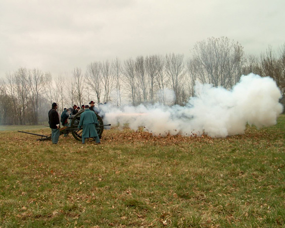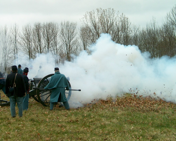 BOOM! The cannons fired, causing a huge cloud of smoke.