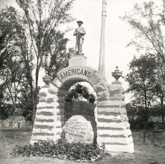 More than 2,000 Confederate troops who died in the camp are buried in its cemetery located off present-day Sullivant Avenue. Some civilians who worked at the camp and considered part of the prison were buried in the cemetery as well. By 1867, most of Camp Chase’s buildings had been dismantled and wood was used for markers in the cemetery. In 1895, the first memorial service was held at the Camp Chase Confederate Cemetery by former Union soldier William H. Knauss and in 1906, Knauss wrote the history of the camp. The present memorial arch was built and dedicated in 1902. Much of Camp Chase today has been consumed by residential and commercial development. The Westgate development built in the late 1920s and early 1930s occupies the greatest portion of the camp’s location. For more information on Camp Chase Confederate Cemetery, click here.