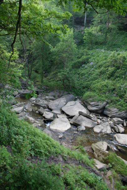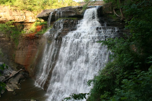The OES visited Brandywine Falls on May 26, 2010. Located in the Cuyahoga Valley National Park, the 60-foot Brandywine Falls is easily the most popular destination in the park and often the site of weddings. Brandywine Creek began around 10,000 years ago when the last glaciers retreated. As the creek cut through the layers of sandstone and shale, Brandywine Falls was born. The rock exposed by the falls was formed between 320-400 million years ago when ancient seas left behind sediments that were later compressed into rock. The more resistant Berea Sandstone forms the top layer, while the more vulnerable Bedford and Cleveland Shale are below. This causes the sandstone layer to be undercut, leaving large chunks of sandstone in the creek below the falls. Brandywine Creek continues for about two miles from the falls until it dumps into the Cuyahoga River.