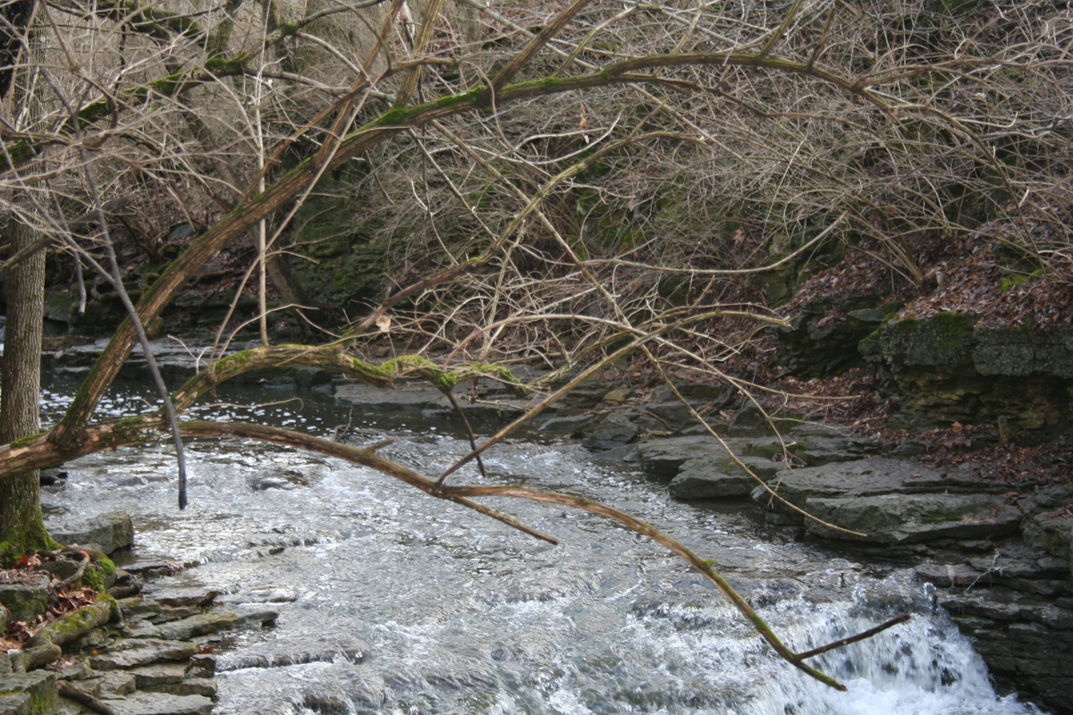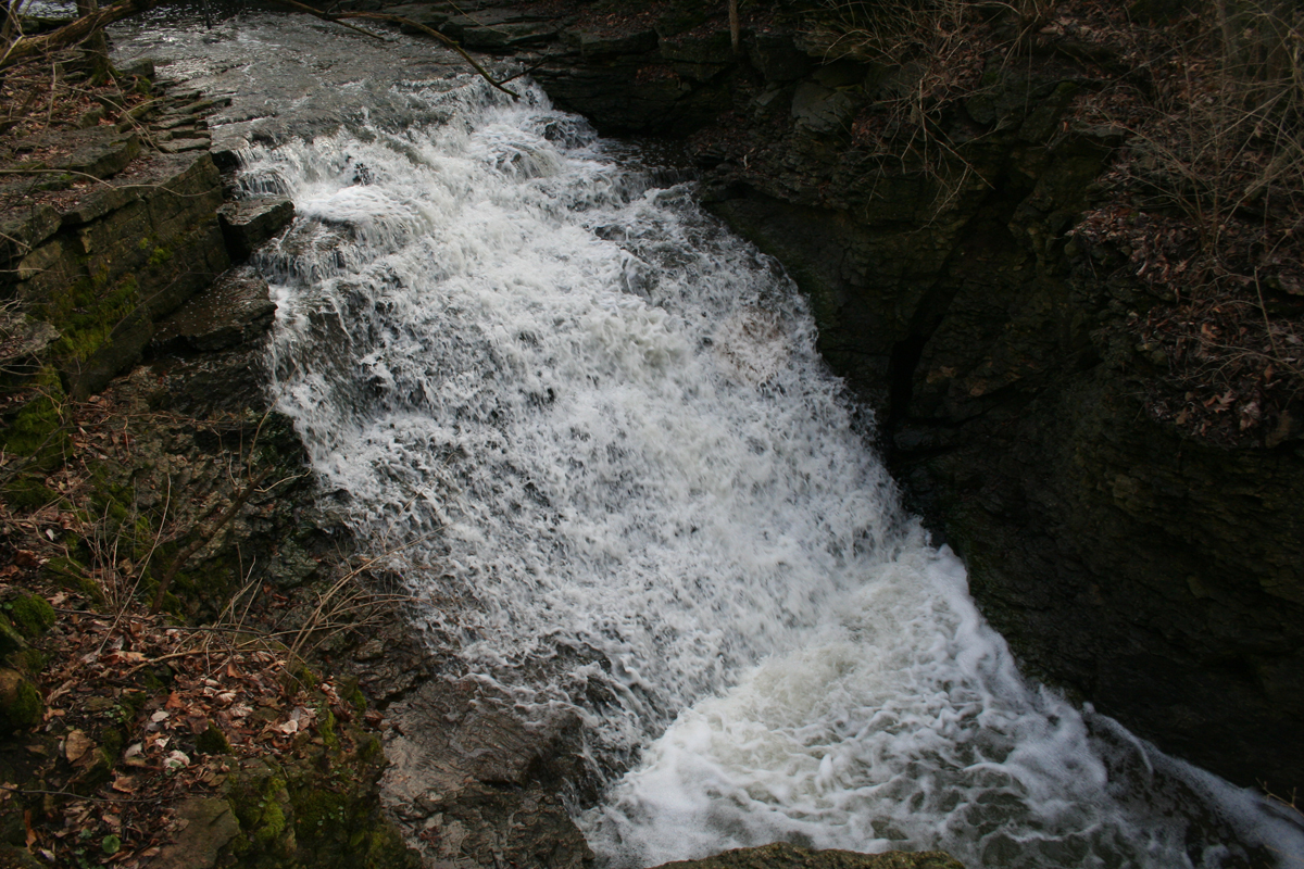 The OES visited Indian Run Falls on March 11, 2006. These falls, like Hayden Falls, seem a little out of place in the urban area surrounding it. The falls are on a more gradual decline than Hayden Falls and the top was not quite as tall. The water going over the falls eventually ends up in the Scioto River about a half mile downstream. The area surrounding the falls was home to the Wyandot Indians before settlers began developing the land. There was a rather high bridge that overlooked the gorge, but there wasn’t an easy way to access the bottom of the gorge. The City of Dublin has installed walking paths and boardwalks to make the area easier to access.