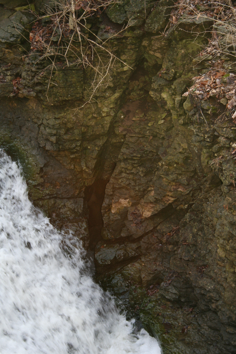 A large fault line next to the waterfall.