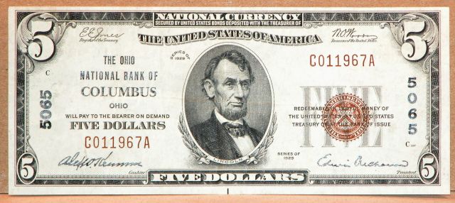 A five dollar bill printed by the Ohio National Bank of Columbus in 1929. Thanks to Paul for allowing us to use this photo.