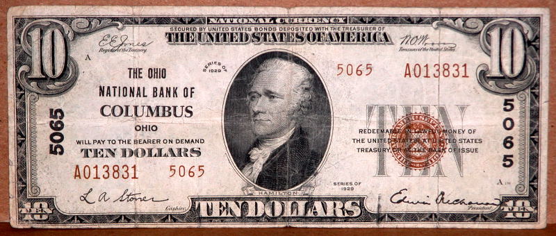 A ten dollar bill printed by the Ohio National Bank of Columbus in 1929. Thanks to Paul for allowing us to use this photo.