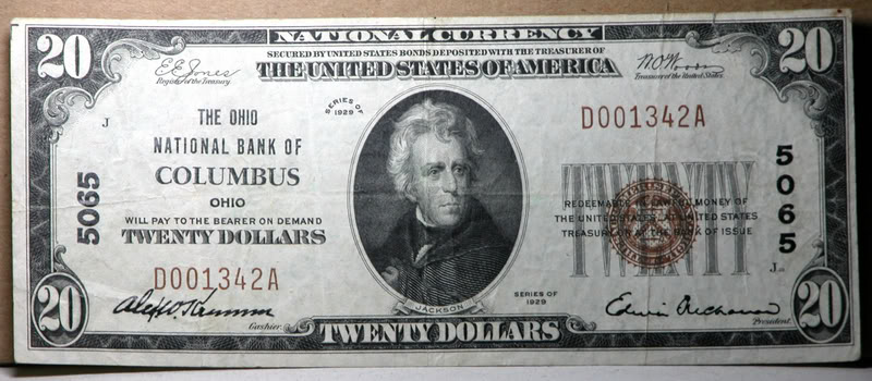 A twenty dollar bill printed by the Ohio National Bank of Columbus in 1929. Thanks to Paul for allowing us to use this photo.