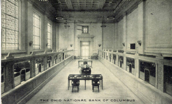 The interior of the Ohio National Bank as it appeared in 1915. This photo was taken from the main entrance toward the vault.