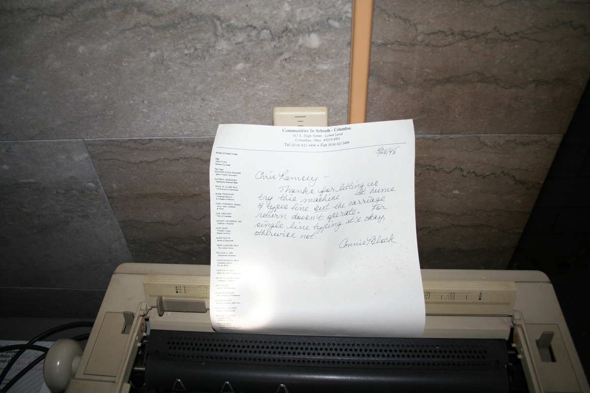 The note in this typewriter dated May 28, 1998 explained that the typewriter typed fine but the carriage return didn't work.