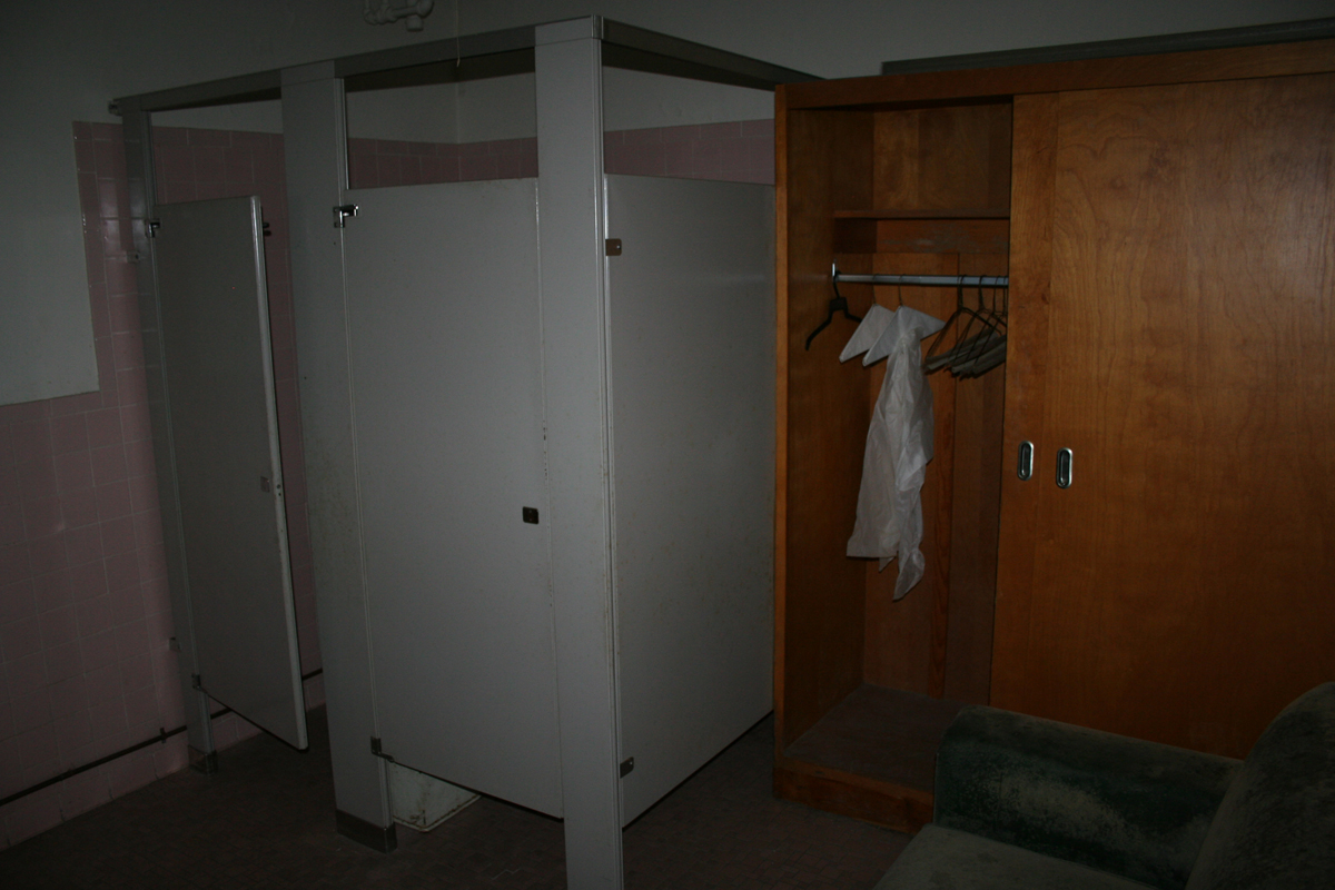 A maintenance area just off of the main storage room with what appeared to be an emergency shower.