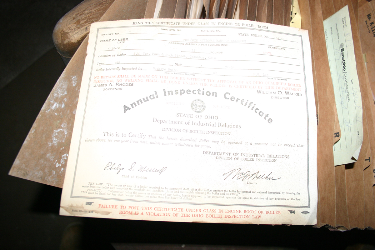 The boiler inspection certificate issued on May 18, 1968, when James A. Rhodes was Governor.