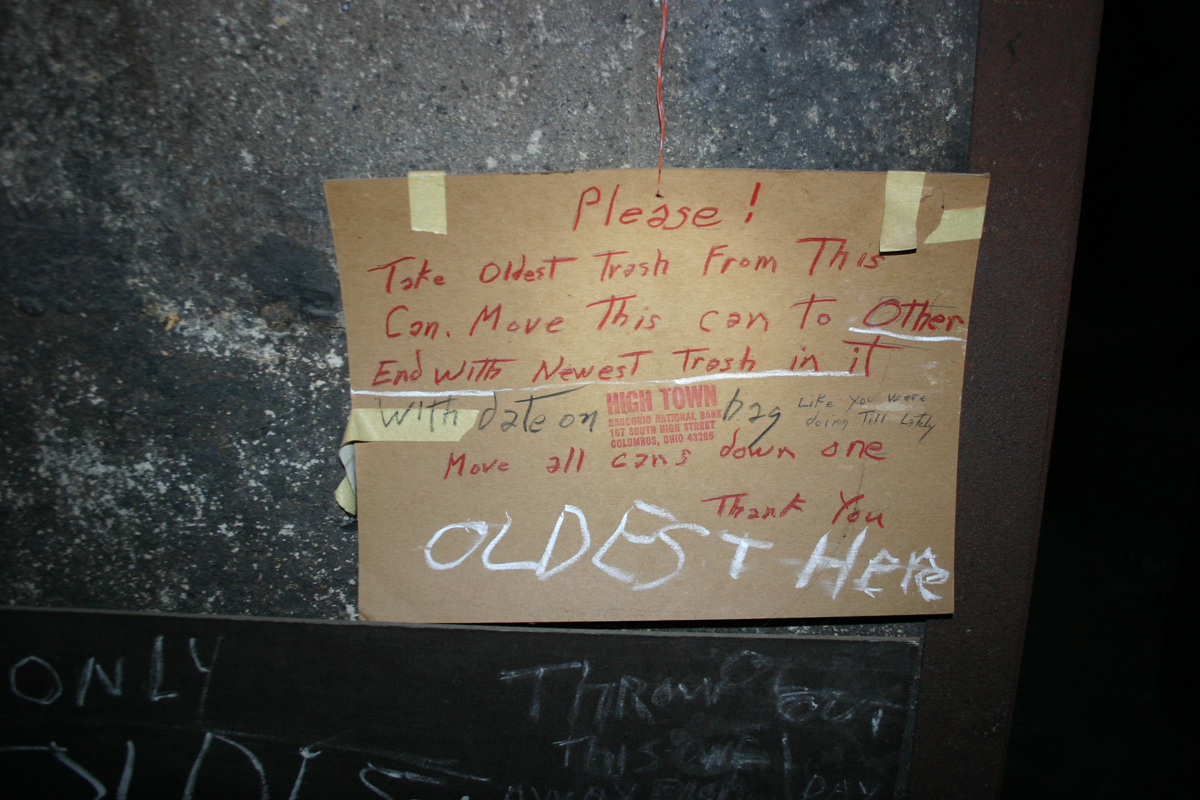 A sign directing maintenance personnel to remove the oldest trash first and shift cans so the oldest is always at the end.