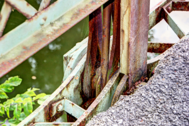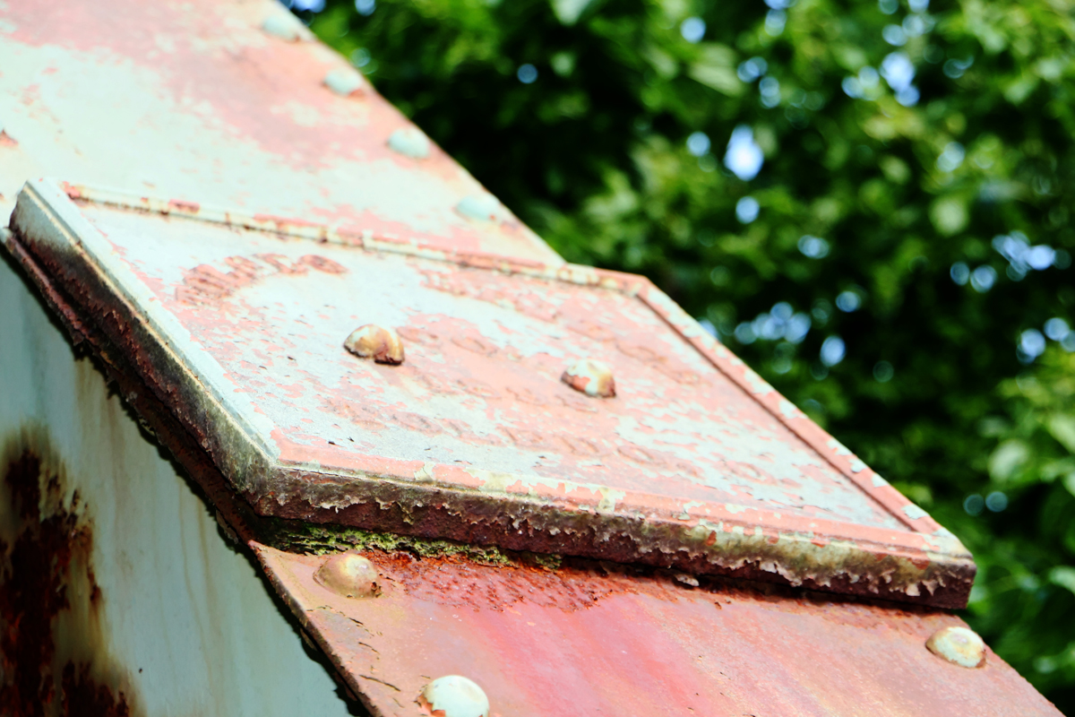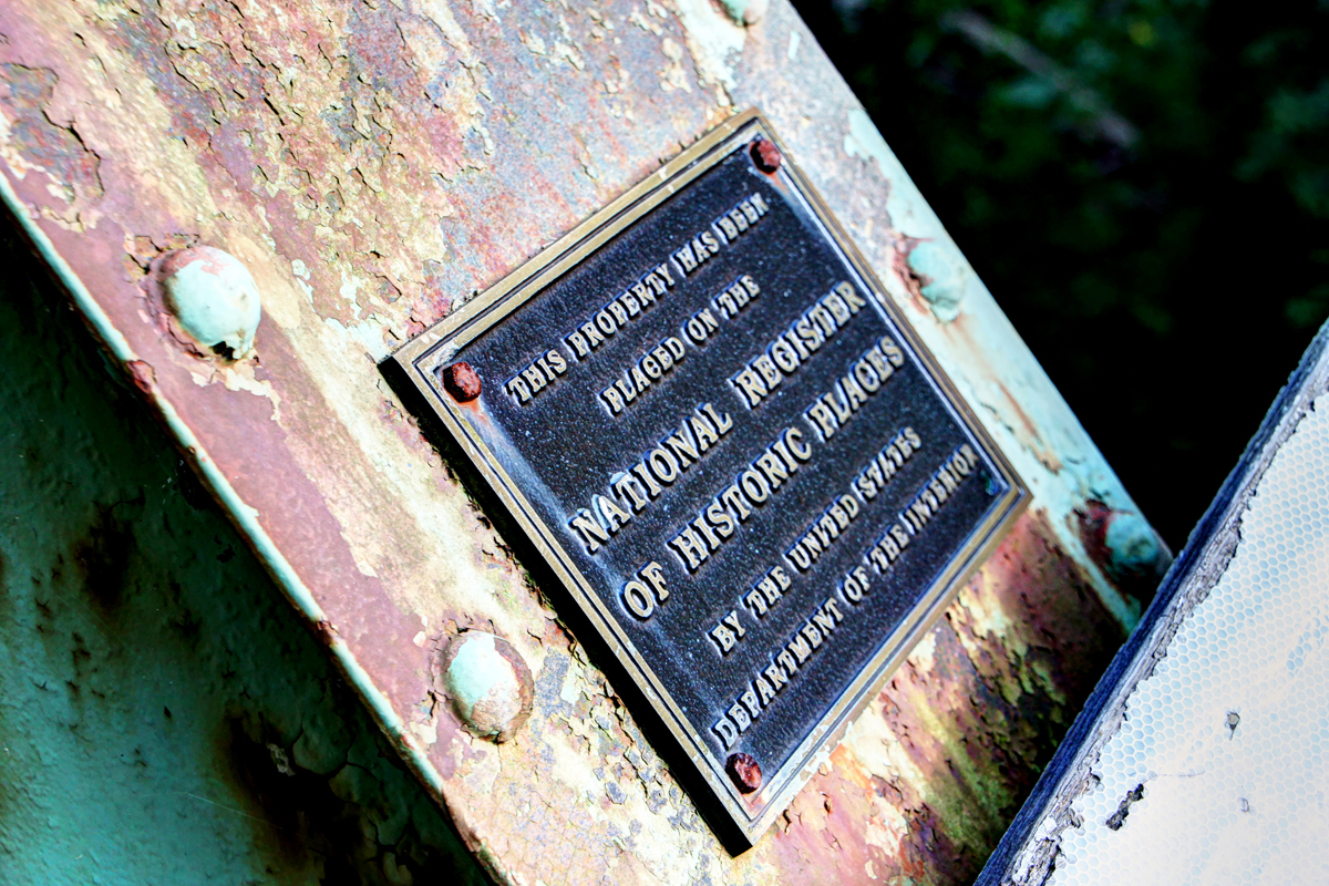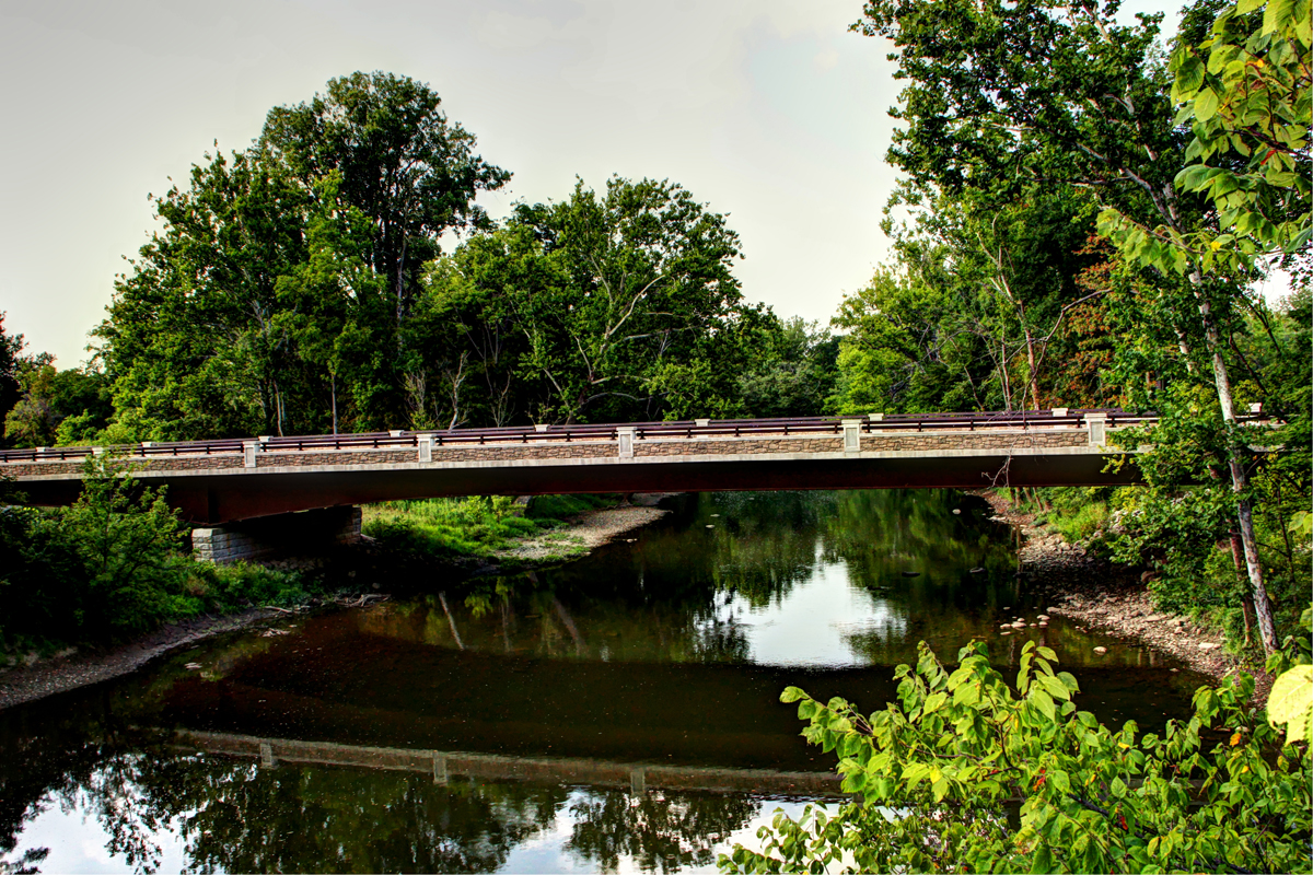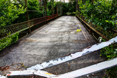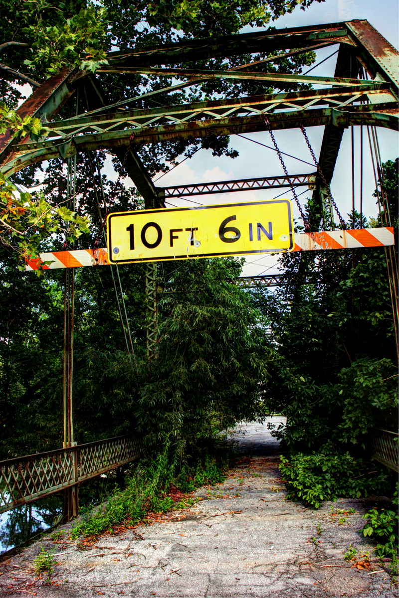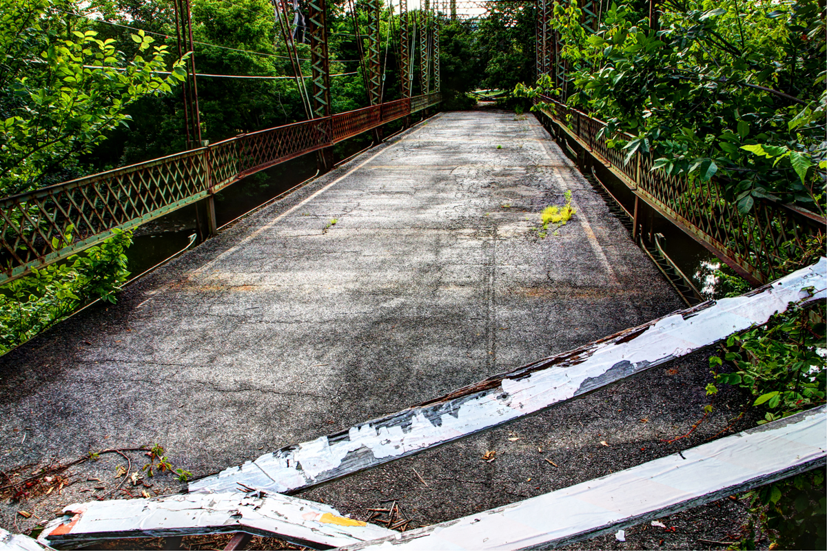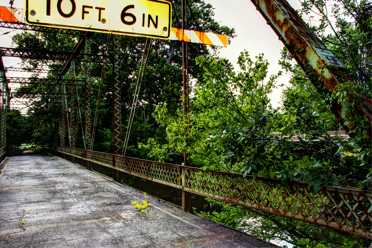 Orange Road Bridge continued to serve the community after the flood. At some point, asphalt was laid on top of the bridge’s original burr and white oak timbers. The bridge underwent a major rehabilitation in 1970. The entire structure was temporarily raised so the old bridge seats could be replaced by new concrete seats reinforced with steel. The bridge’s four vertical hips were reinforced with the addition of 32-foot rods during the rehab as well. In the 1980s, the east abutment was faced with concrete. A single vehicle accident damaged a southern portion of the guard rail in December 2000. The bridge was closed until January 2001 while repairs were made. The dented latticework was still apparent when we visited the site in 2014.
