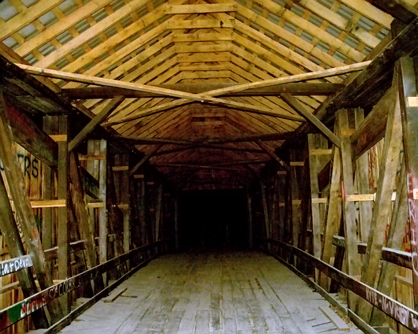 The OES visited Ponn Humpback Covered Bridge on May 30, 2005. Built by Martin McGrath and Lyman Wells in 1874, this unique “hump-back” multiple Kingpost truss covered bridge spanned 174.9 feet across Raccoon Creek on Township Road 4 for nearly 140 years. The bridge was known as Geer’s Mill Bridge and Barnes Mill Bridge, named for a nearby mill that had occupied the site since 1812, before it was known as Ponn Bridge. But the humpback bridge was not the first bridge to cross the creek at the site. The original bridge was built in 1848, two years before Vinton County was formed, and carried traffic for over twenty years. By 1869, county officials had begun the bidding process to construct a new covered bridge, complete with stone abutments, at Barnes Mill. The contract was awarded to James Barnes, who completed the new bridge in 1870 for $2,680. However, that bridge’s lifespan was cut short when an arsonist burned it to the ground on May 26, 1874. Despite posting a $1,000 reward for the capture of the person(s) responsible for the fire, no one was ever brought to justice.