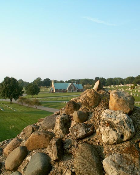 A view of the chapel from a large hill in the cemetery.