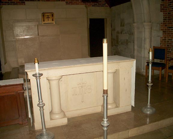 The altar on the stage area and some large candles.