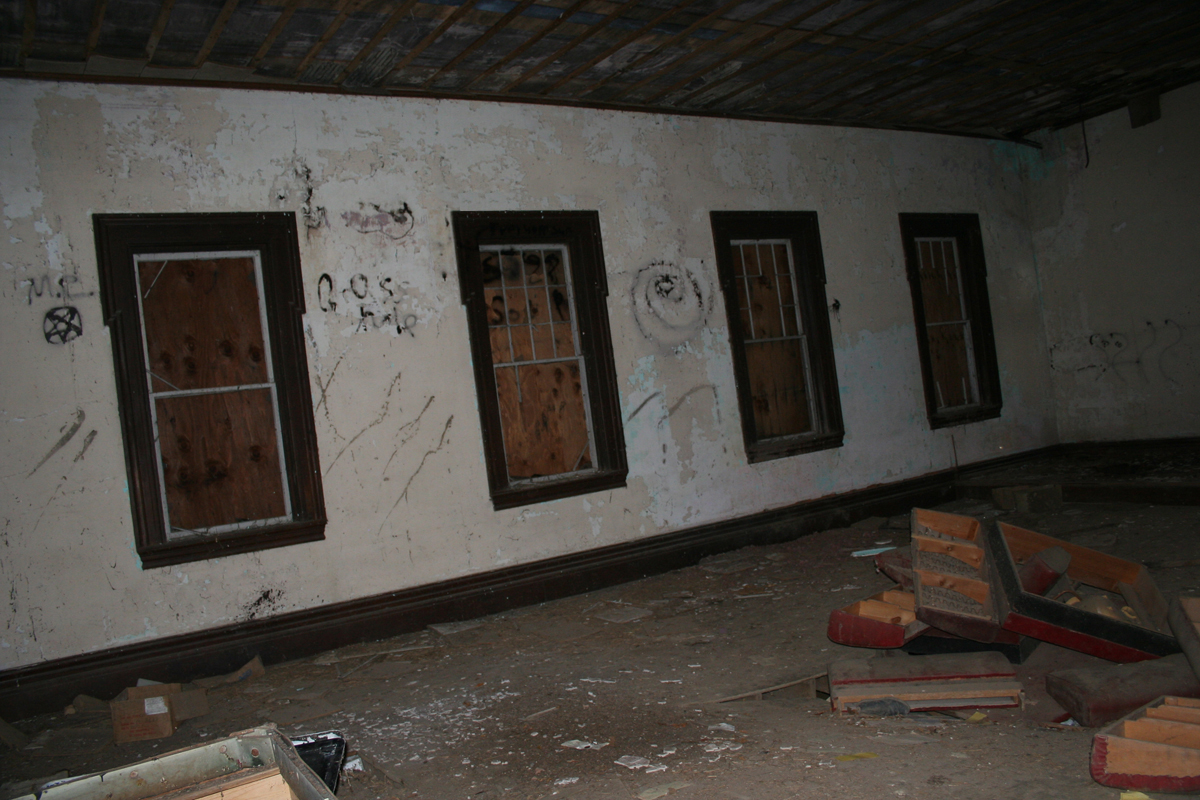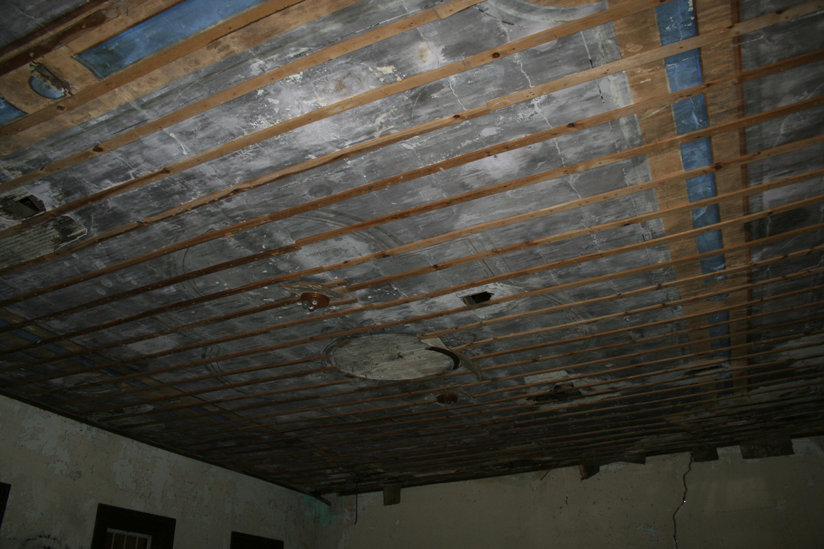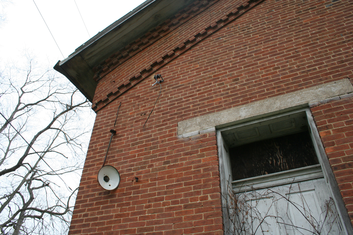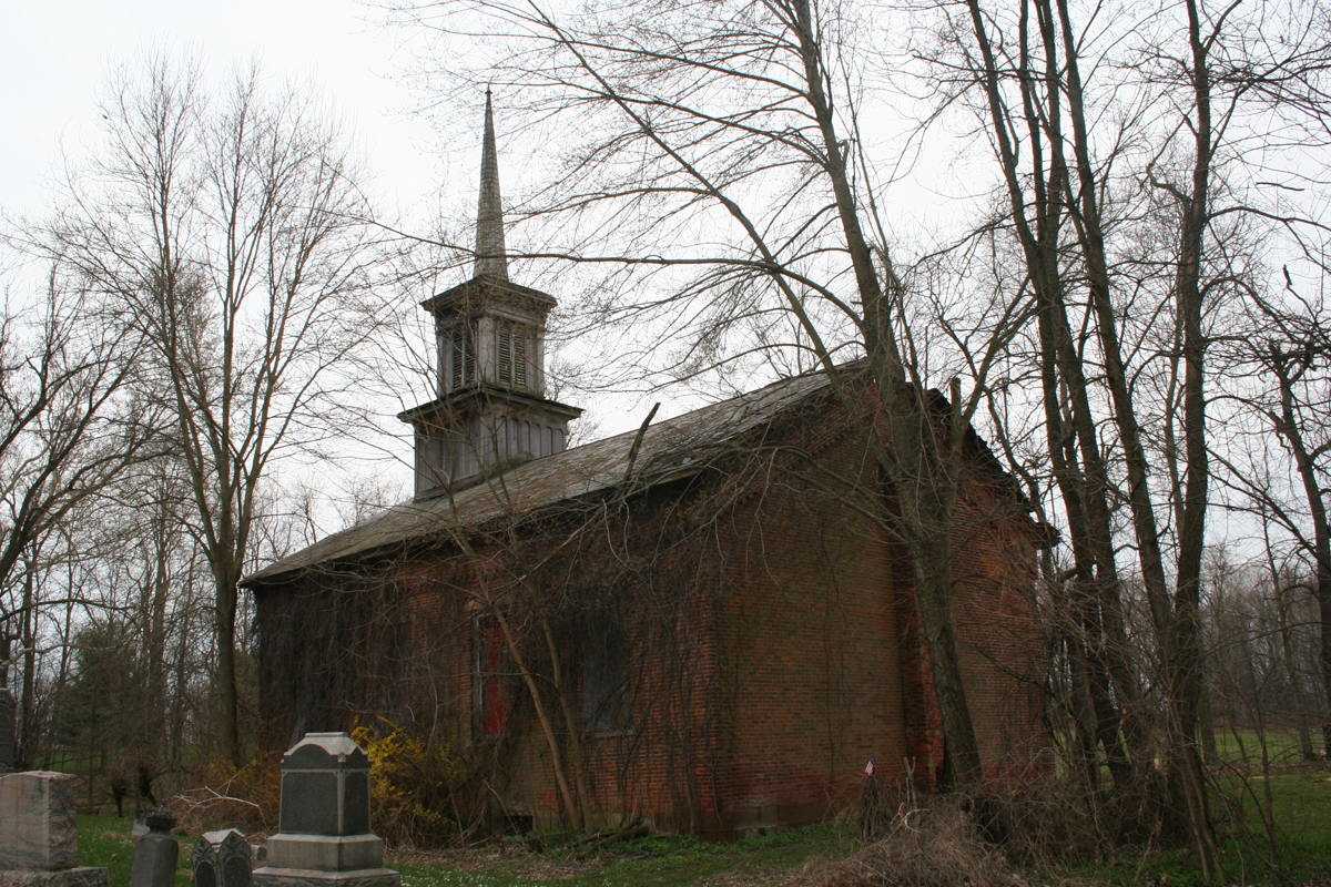 The OES visited Salem Evangelical Lutheran Church on April 19, 2008. Also known as the Bellville Lutheran Church, the congregation was organized around 1838 by a man named Reverend Ritz. However, the brick structure standing today was built in 1860. When erected, it was described as a brick church building of modern architecture. Other than these facts, we could not find much else in the way of historical information about the church. During our visit, ti looked like the church had been abandoned for quite some time. No pulpit, altar, pew or anything else that would have distinguished the interior as a church remained. A thick layer of dust and dirt covered the floor, along with trash and what appeared to be a busted bookcase. Some of the ceiling’s original paint remained. It looked like the ceiling may have been covered at some point, perhaps by decorated tin or copper, since thin wooden boards striped the ceiling. The exterior of the building seemed sound with the exception of the base of the chimney and a large crack at the rear of the building. Salem Cemetery is located adjacent to the church. If you have any additional information about Salem Evangelical Lutheran Church, please email .